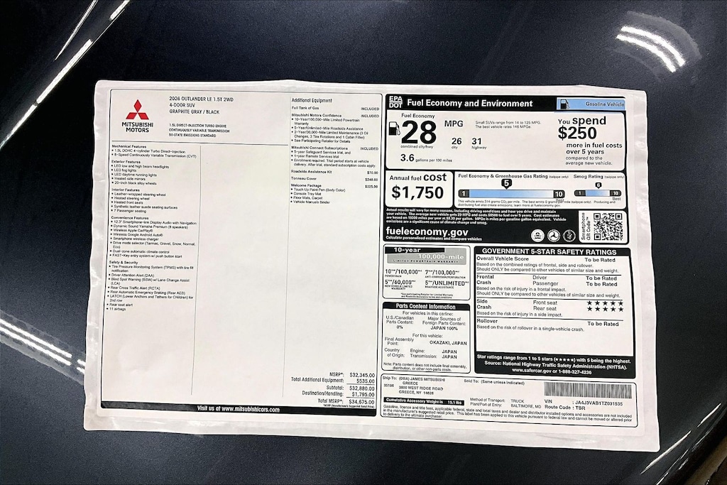 I am impressed, this Outlander has great fuel economy about 25 to 30 in town and over 35 on the highway. The interior is spacious and very nicely done. I love the dash and the easy to use functions. I'm not it savvy, but the touch screen options are easy to navigate. The body style is attractive, the front end is nice to look at. The standard options are everything I would want, heated seats, heated sideview mirrors etc. Visibility is very good and parallel parking a breeze. The large screen is so nice for backing up. Also the camera option is nice when parking. I like the exterior and interior colors. This vehicle has plenty of get up and go to make mergingon to the highway easier. - 5.0